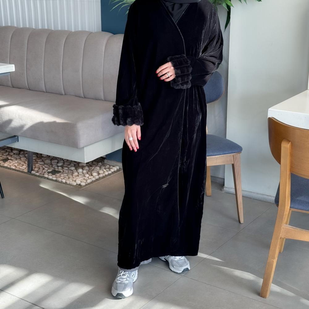مواصفات العبايه : مخمل مع فرو اسود من الظهر والمعصم ومطعمه بشريط كريستال بالصدر والظهر