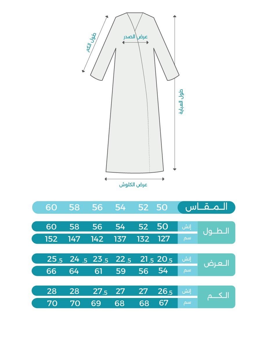 - طول العباية يؤخذ من الكتف الى أسفل الكعبين (من الأمام)